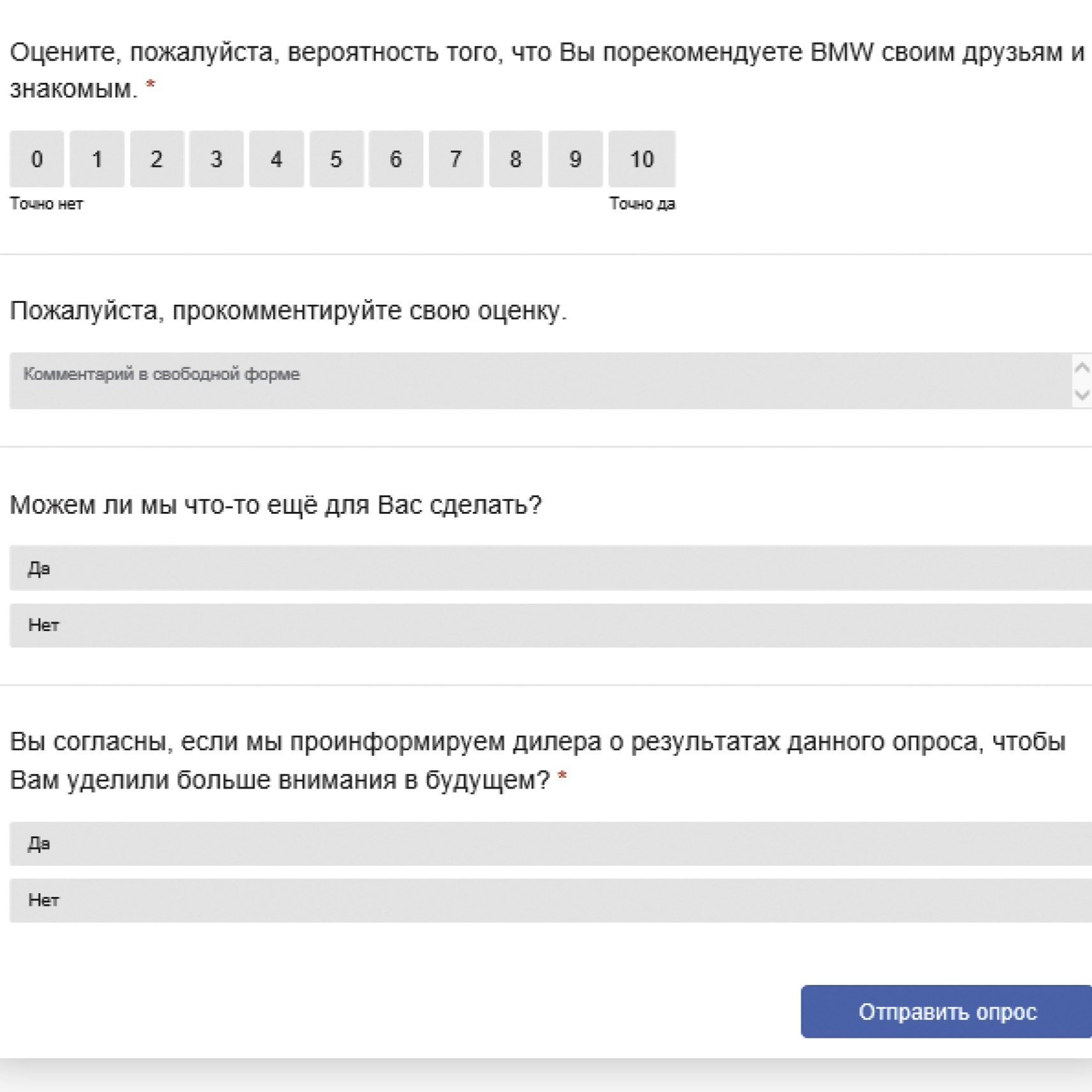В течение нескольких дней после приобретения автомобиля / мотоцикла или сервисного обслуживания Вы получите СМС сообщение или электронное письмо с ссылкой на опрос. Поделитесь своими впечатлениями и оставьте пожелания по улучшению качества нашей работы, чтобы мы стали еще лучше, а удовольствие от вождения — безусловным.